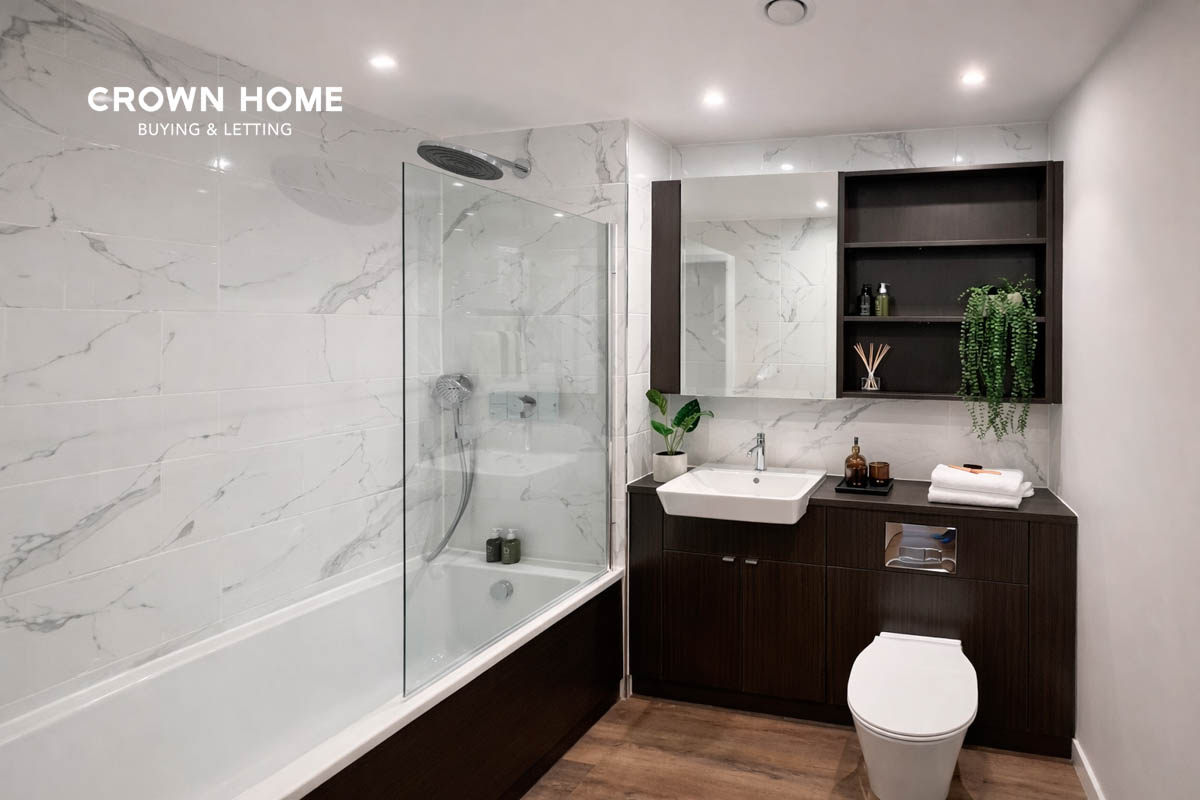 In the bedroom, the plush Cormar Sensations Twist carpet adds warmth, while built-in wardrobes with silver mirrors and soft glass panels provide ample storage. The bathroom has ceramic wall tiles, and a bespoke mirrored cabinet with integrated lighting complements.