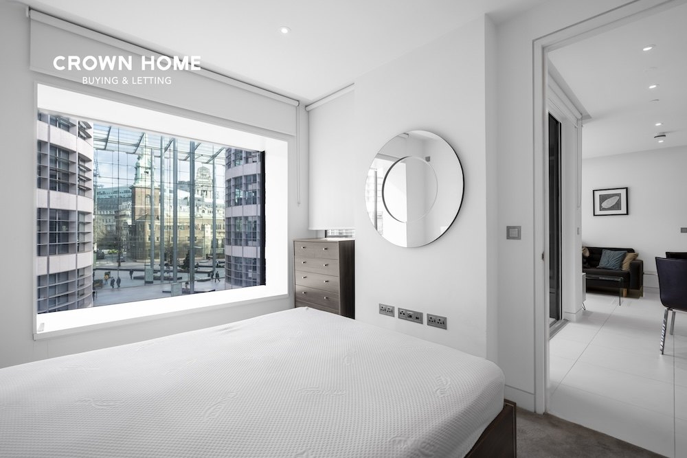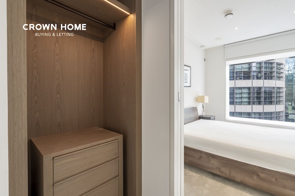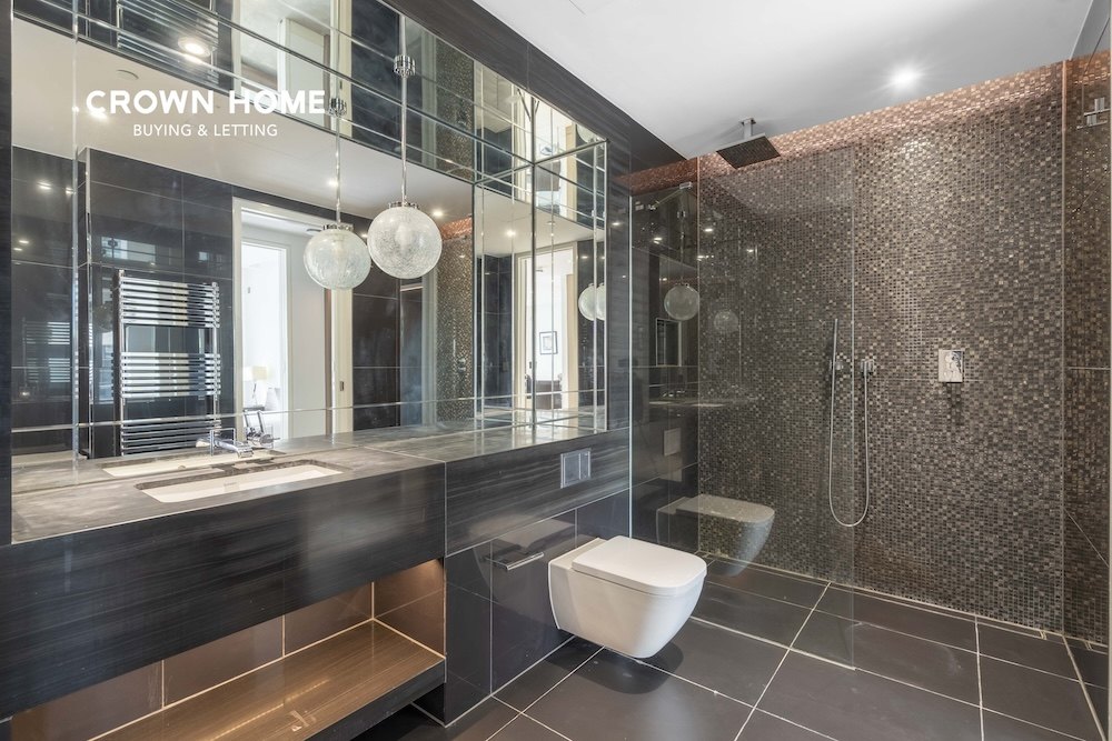 The bedroom is designed with custom-built wardrobes and plush carpeting, offering a serene and inviting retreat. The bathroom features a darker palette, with polished marble surfaces, chrome fixtures, and intricate mosaic detailing inspired by London’s Roman heritage, adding a sophisticated and elegant touch. Underfloor heating and comfort cooling ensure year-round comfort.