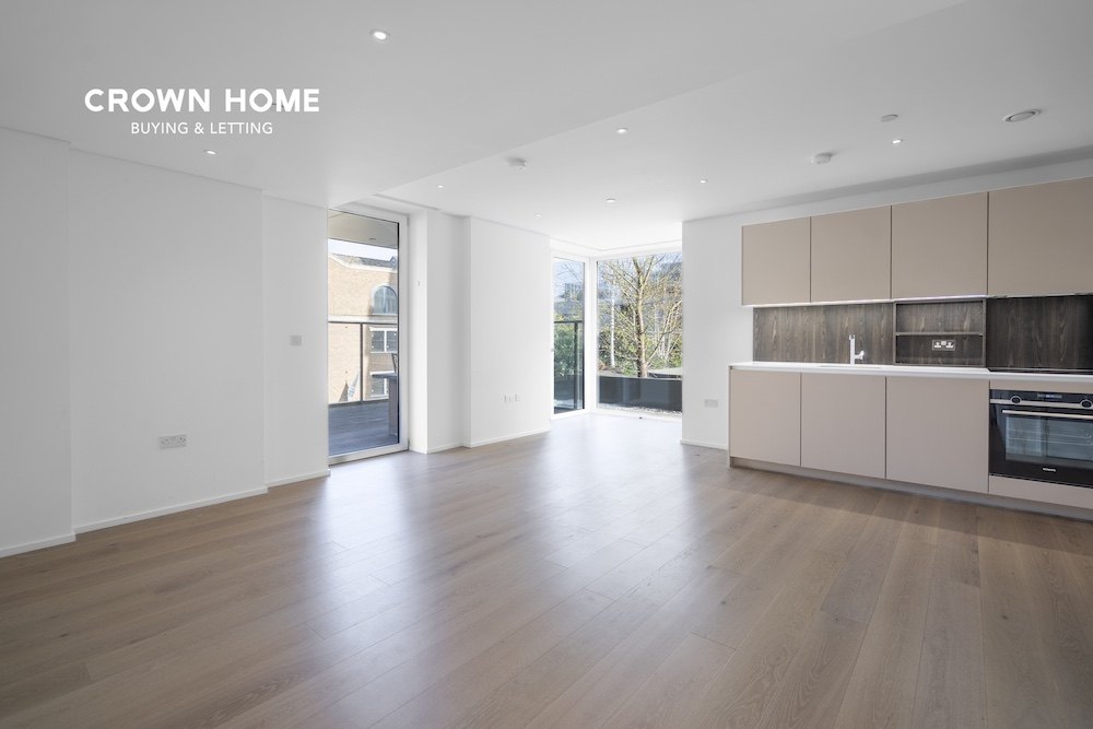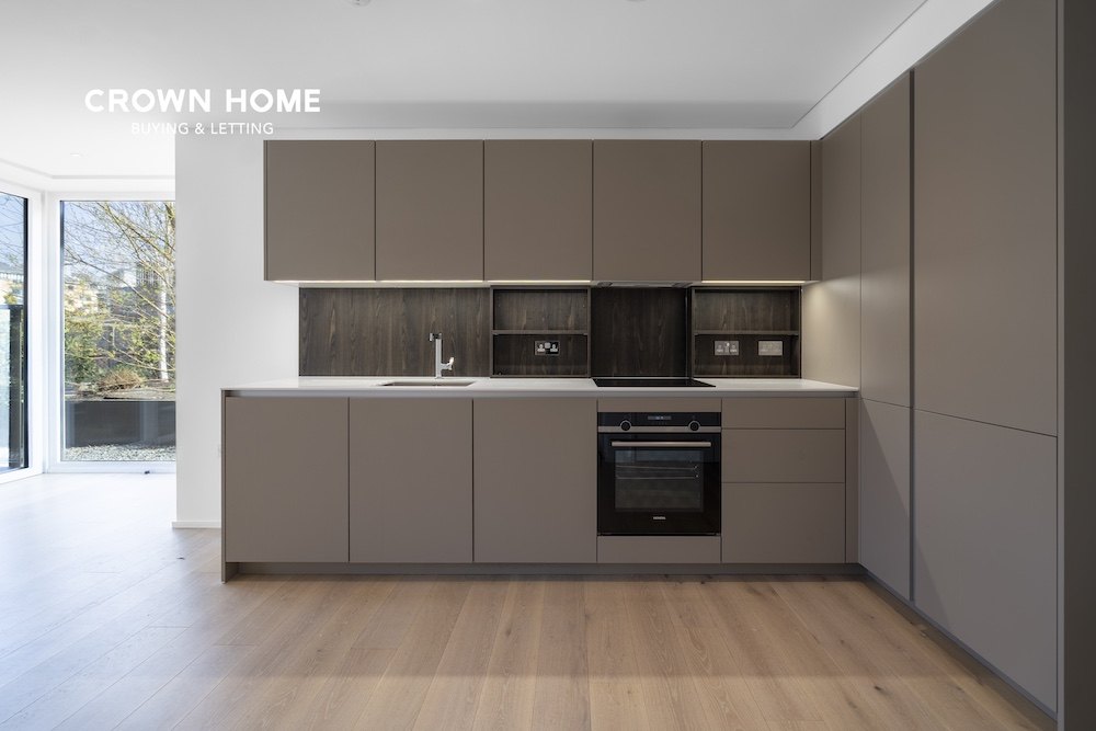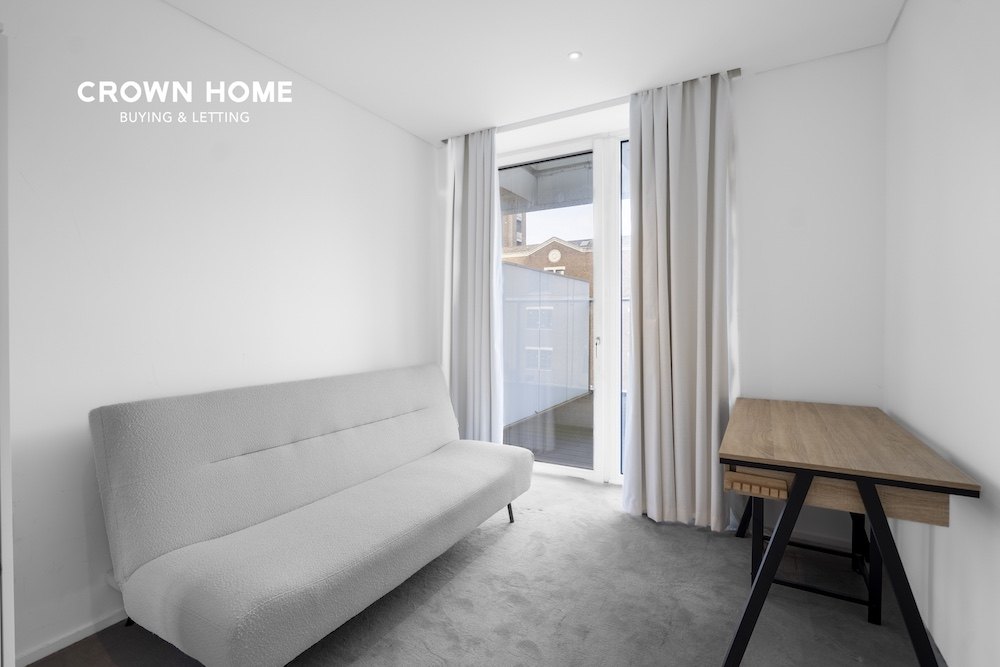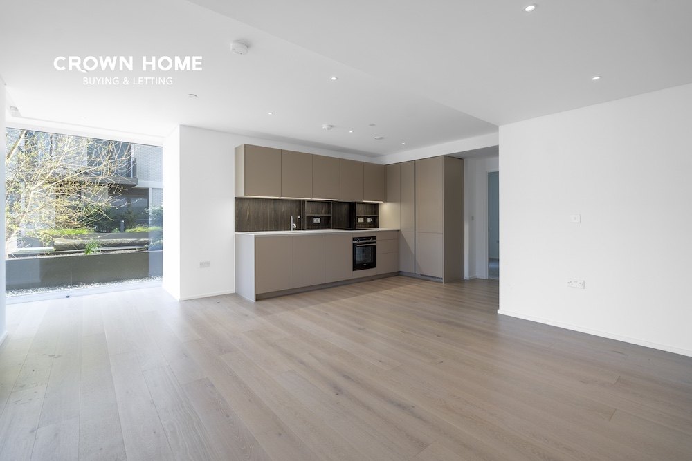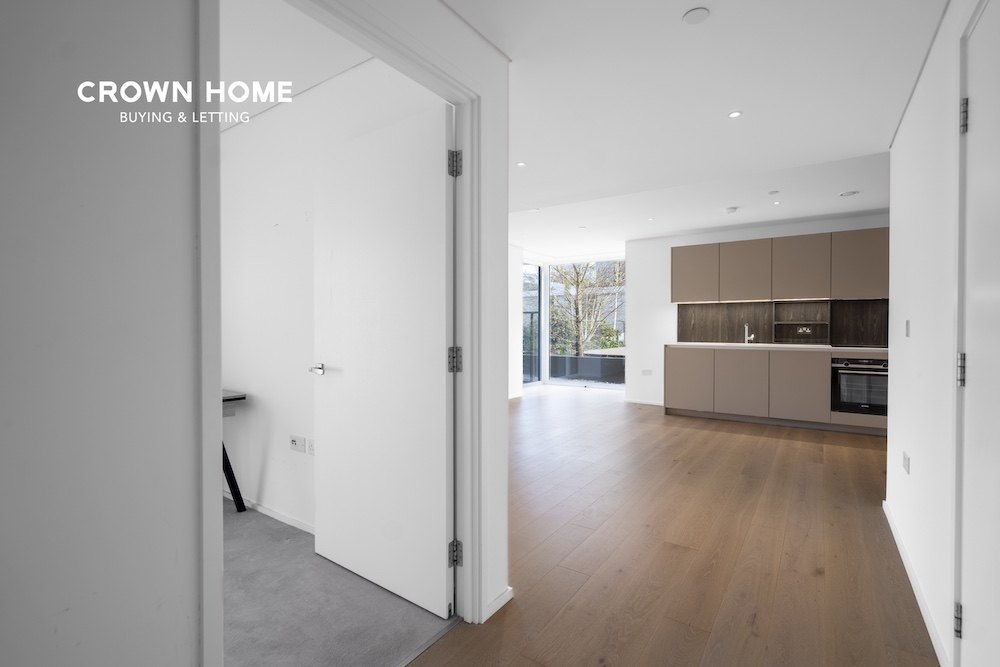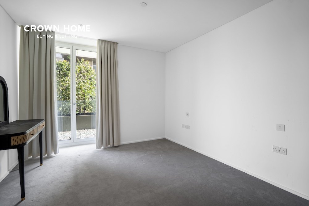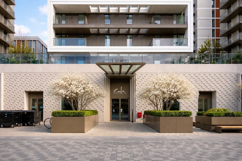A bright and spacious two-bedroom apartment in the sought-after Coda Residences, featuring floor-to-ceiling windows that flood the space with natural light. The apartment offers a contemporary finish throughout, with wood flooring in the living areas and soft carpeting in both bedrooms. The sleek kitchen is fitted with high-quality Miele integrated appliances, while a generous terrace of approximately 407 sq ft provides excellent outdoor space for relaxing or entertaining.