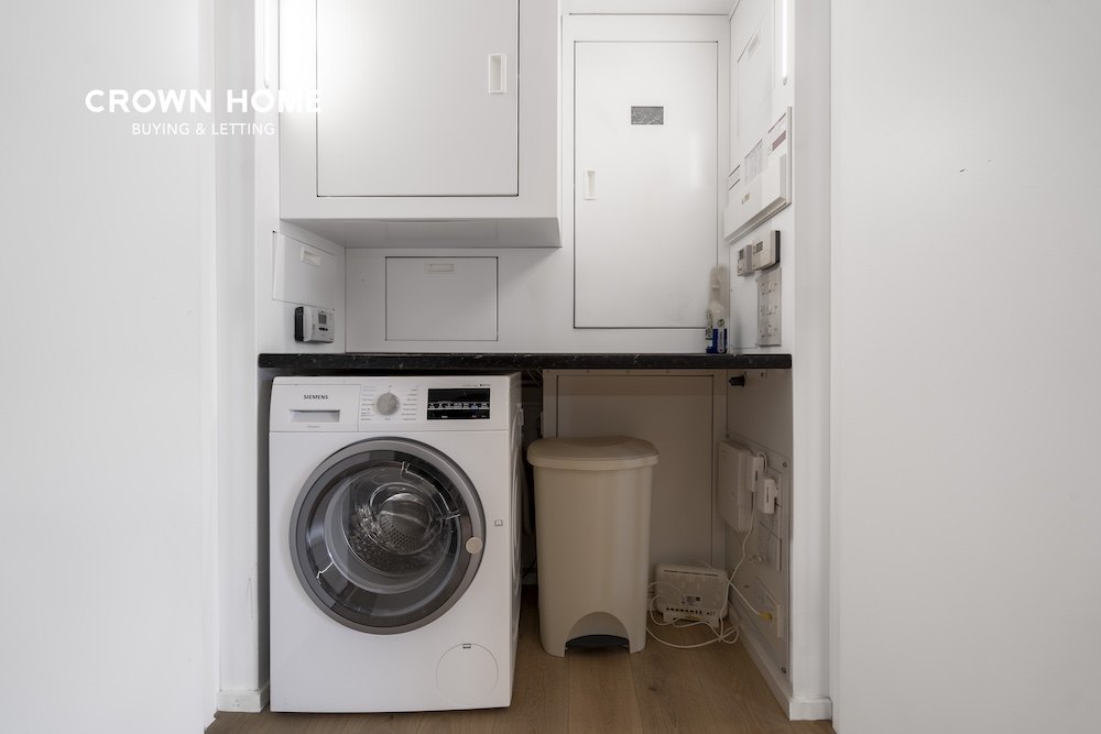 The layout includes two well-proportioned bedrooms, a stylish main bathroom with a bathtub, and an en-suite with a walk-in shower. Both bathrooms are beautifully tiled and finished with well-lit vanity units. Additional features include a hallway utilities cupboard with a Siemens washer and ample storage, as well as comfort cooling for year-round comfort.