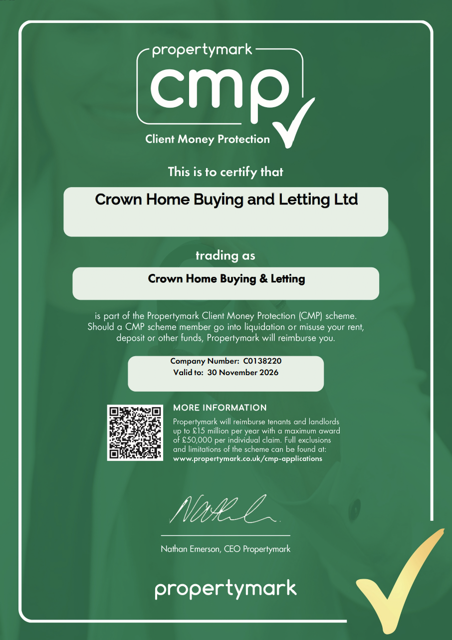 Crown Home® Buying and Letting Ltd. are proud to be a member of the Client Money Protection Scheme (CMP).