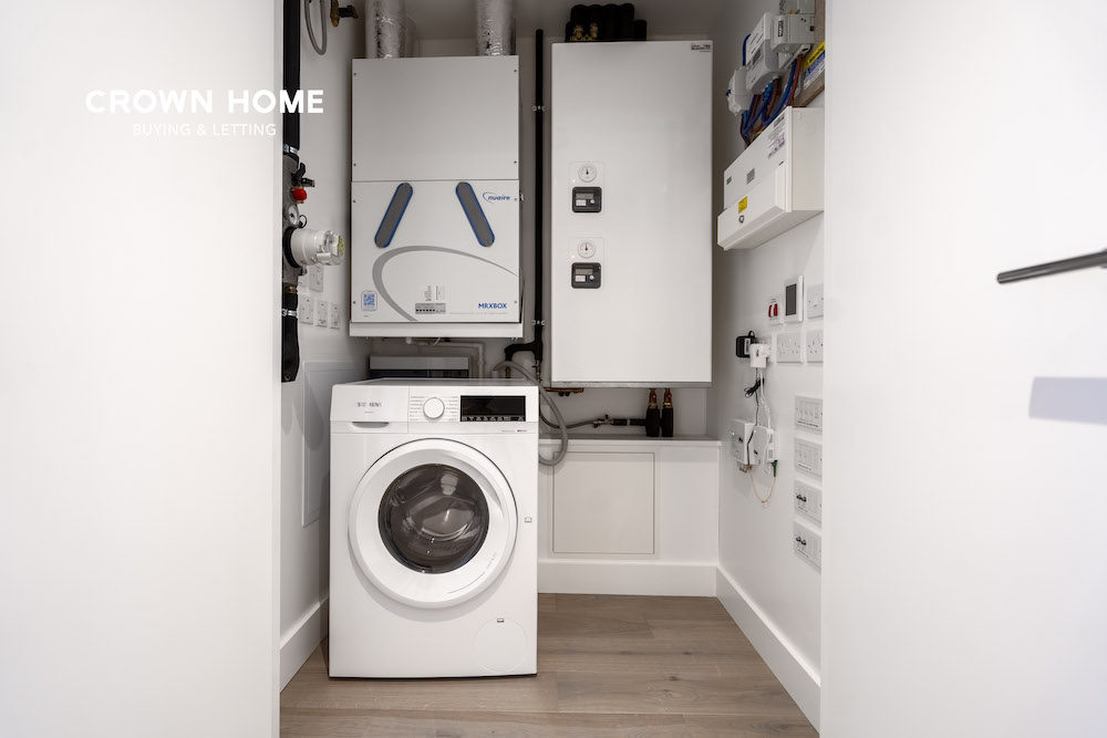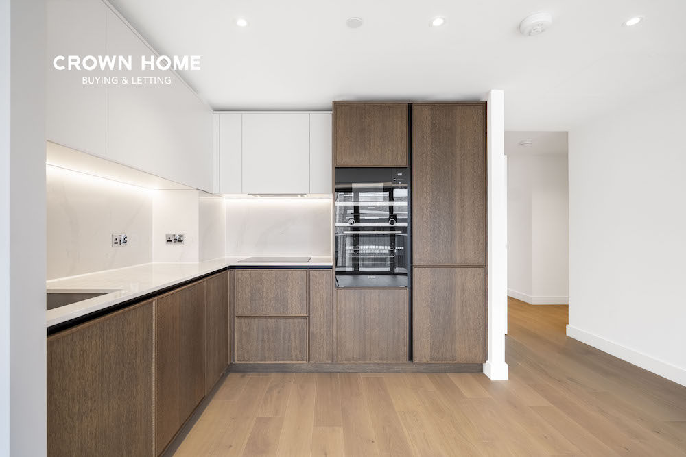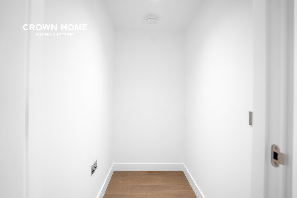 The spacious living area, hallway, and kitchen are laid with high-quality engineered wood flooring in an elegant Oak Bandol Midi Classic finish. The kitchen is fitted with sleek white cabinetry, luxurious Silestone Calacatta Gold worktop and splashback, and fully integrated appliances for a streamlined, practical space.
