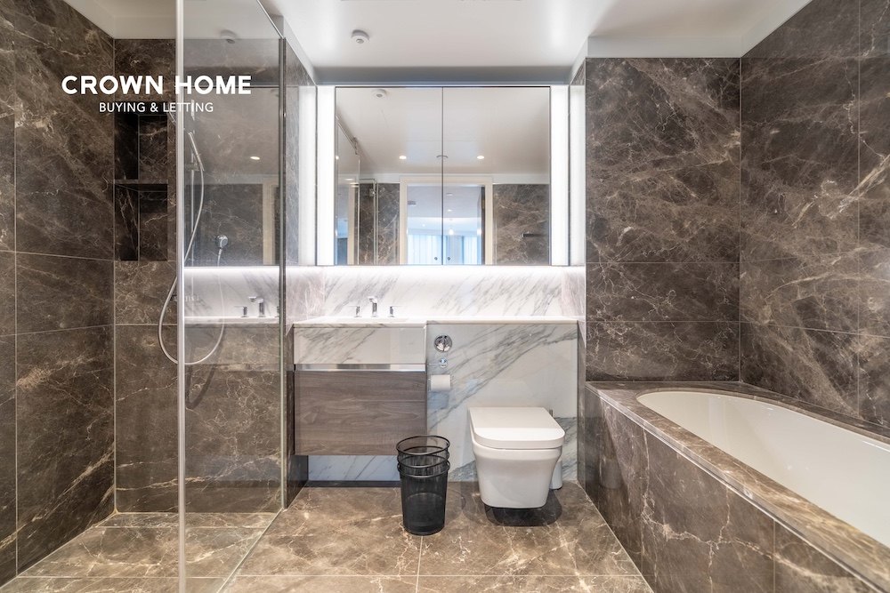 Both generously sized bedrooms provide peaceful retreats, complete with plush carpeting for added comfort. The principal bedroom benefits from fully integrated wardrobes and a stylish ensuite bathroom. The property also includes a modern family bathroom, with one featuring a bathtub and the ensuite offering a walk-in shower. All bathrooms are finished to a high standard with marble detailing, vanity units, and heated towel rails.