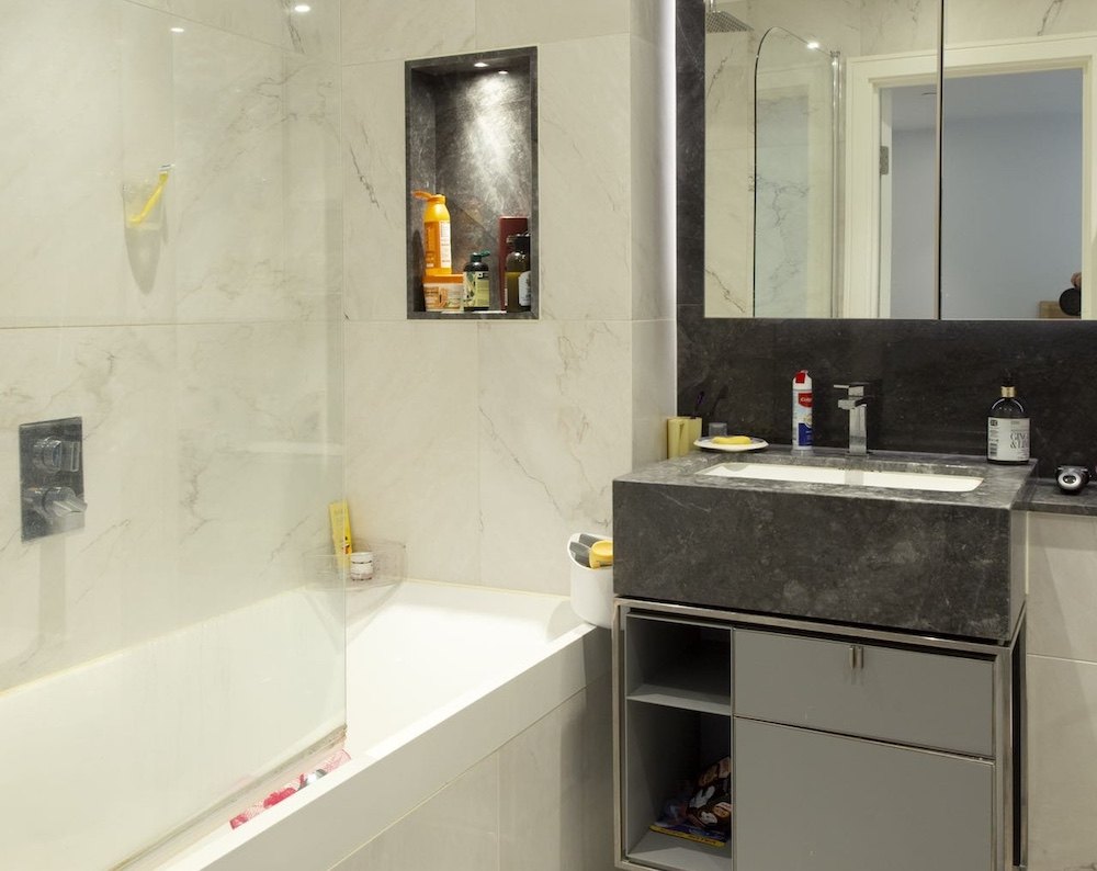 The bathroom is finished with striking black-and-white marble-effect tiling and includes a bathtub, a well-lit vanity unit with storage, and a practical shampoo niche.