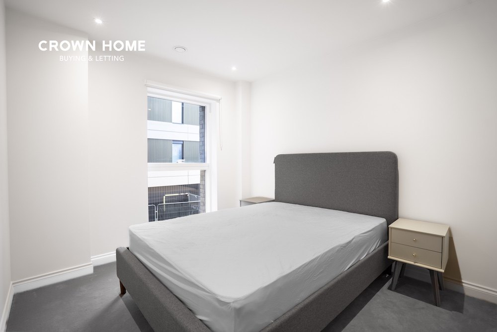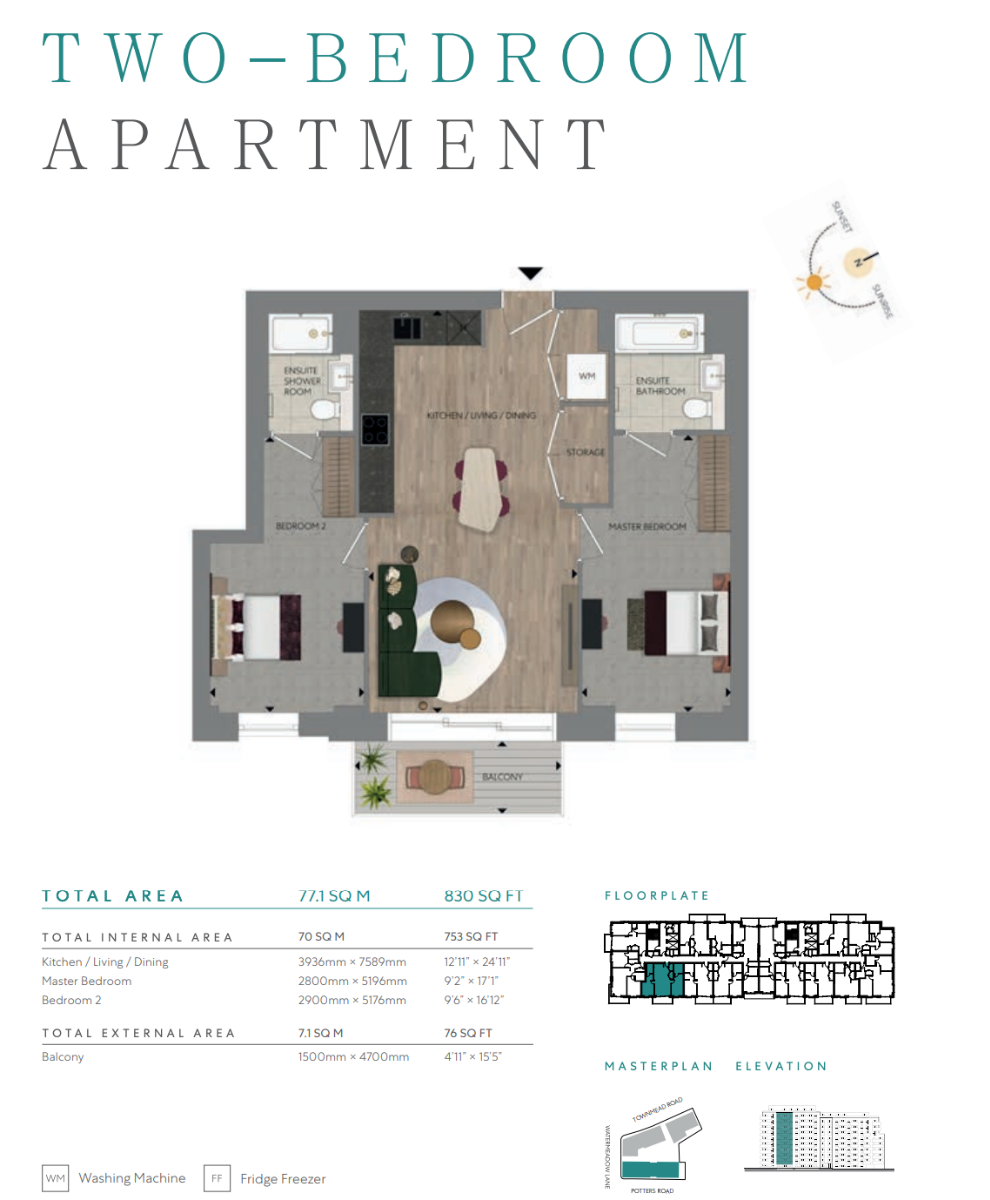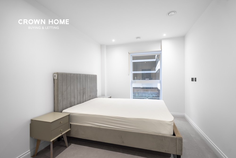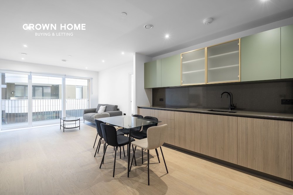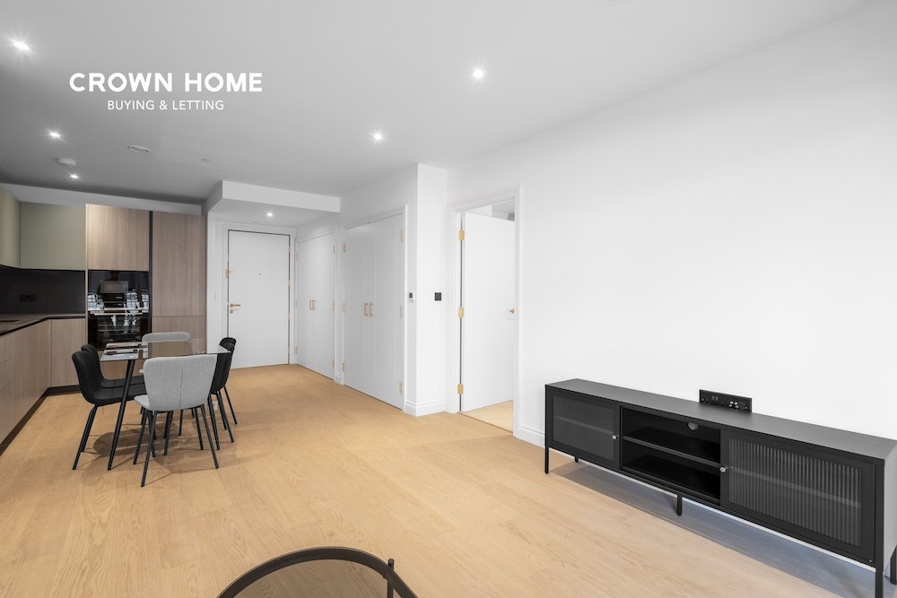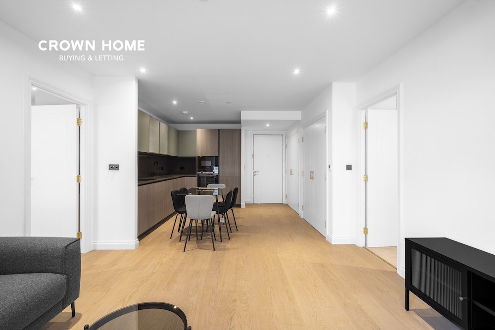 The living, kitchen, and dining areas are styled with engineered timber flooring and a sleek stone-topped kitchen equipped with Siemens integrated appliances. Both bathrooms are finished in large-format porcelain with a natural stone-effect, enhanced by an onyx feature wall, bespoke fluted vanities, oval mirrors, a full bathtub in the main bathroom, and a walk-in shower in the ensuite. The apartment includes energy-efficient LED lighting, black finish switches and sockets with USB points, a washer–dryer in the utility cupboard and underfloor heating throughout.