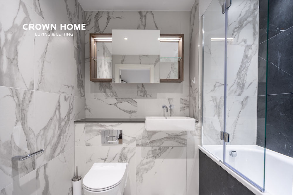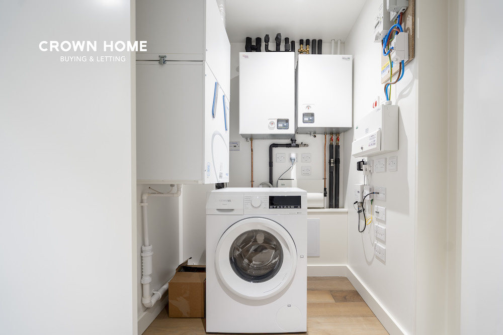 Both bedrooms feature plush carpeting and built-in wardrobes providing excellent storage. The principal bedroom enjoys its own luxurious en-suite bathroom, while the second bathroom, located off the hallway, is finished with beautiful marble-effect interiors and includes a generously sized bathtub. Additional conveniences include a hallway storage cupboard and a separate utility cupboard housing a washer and dryer.