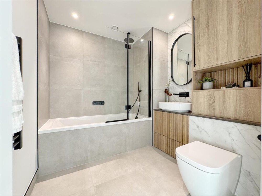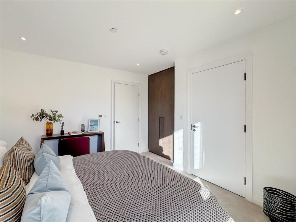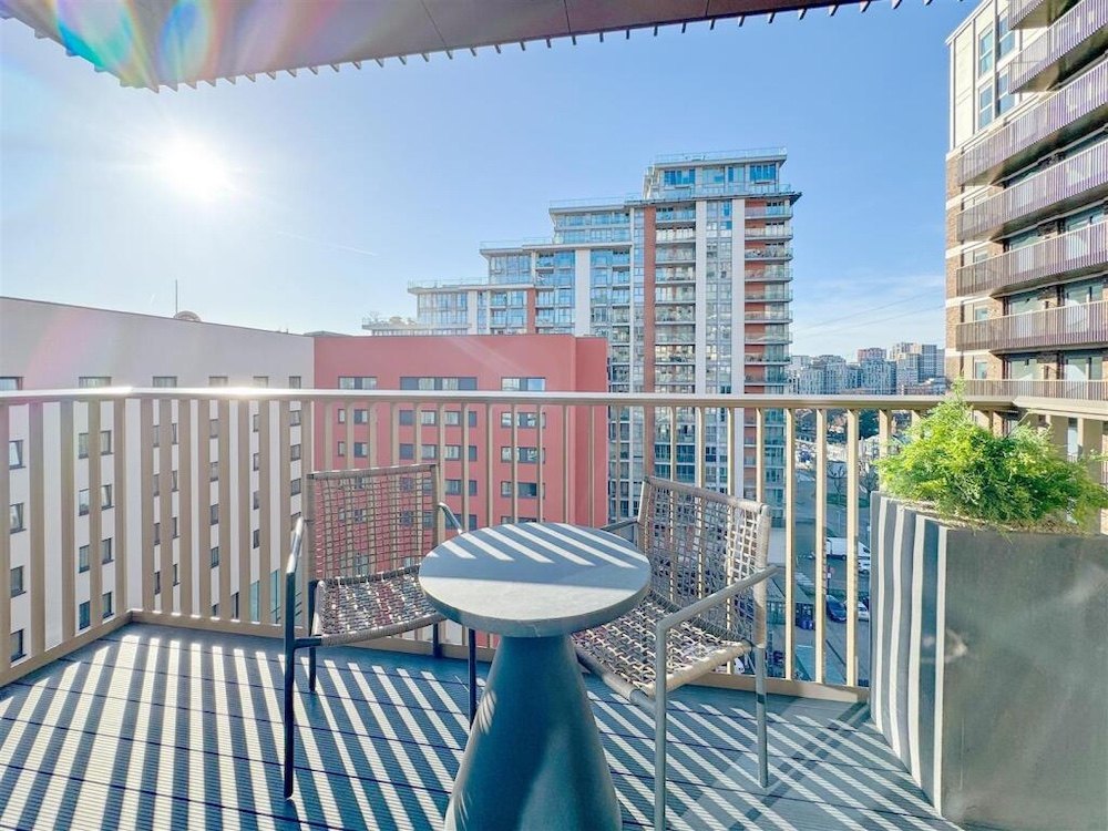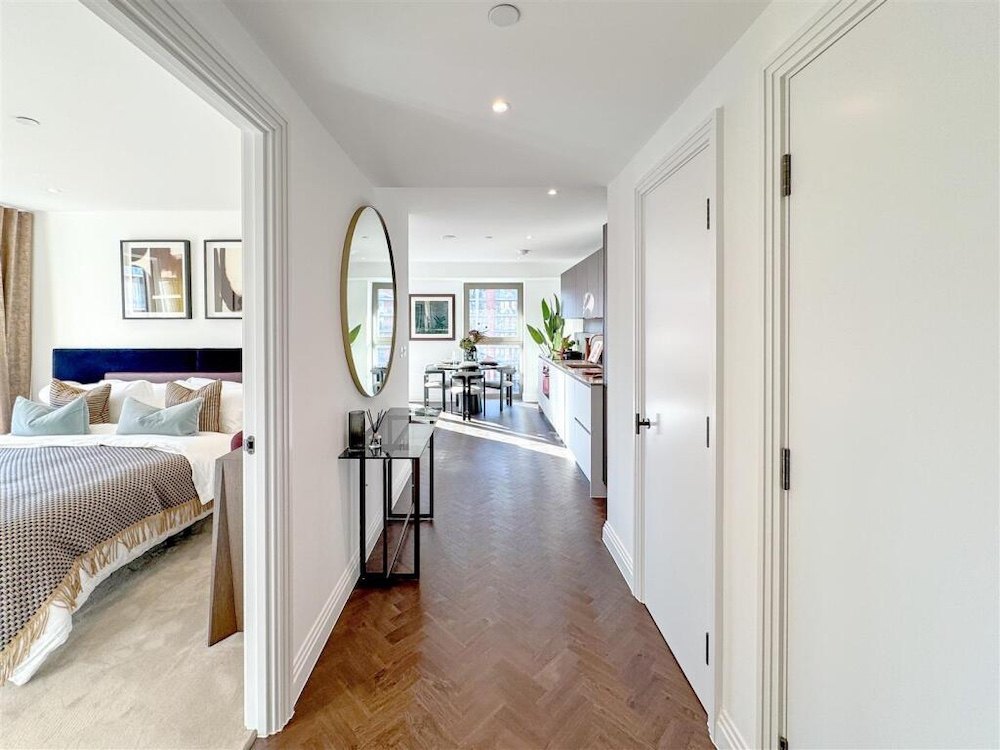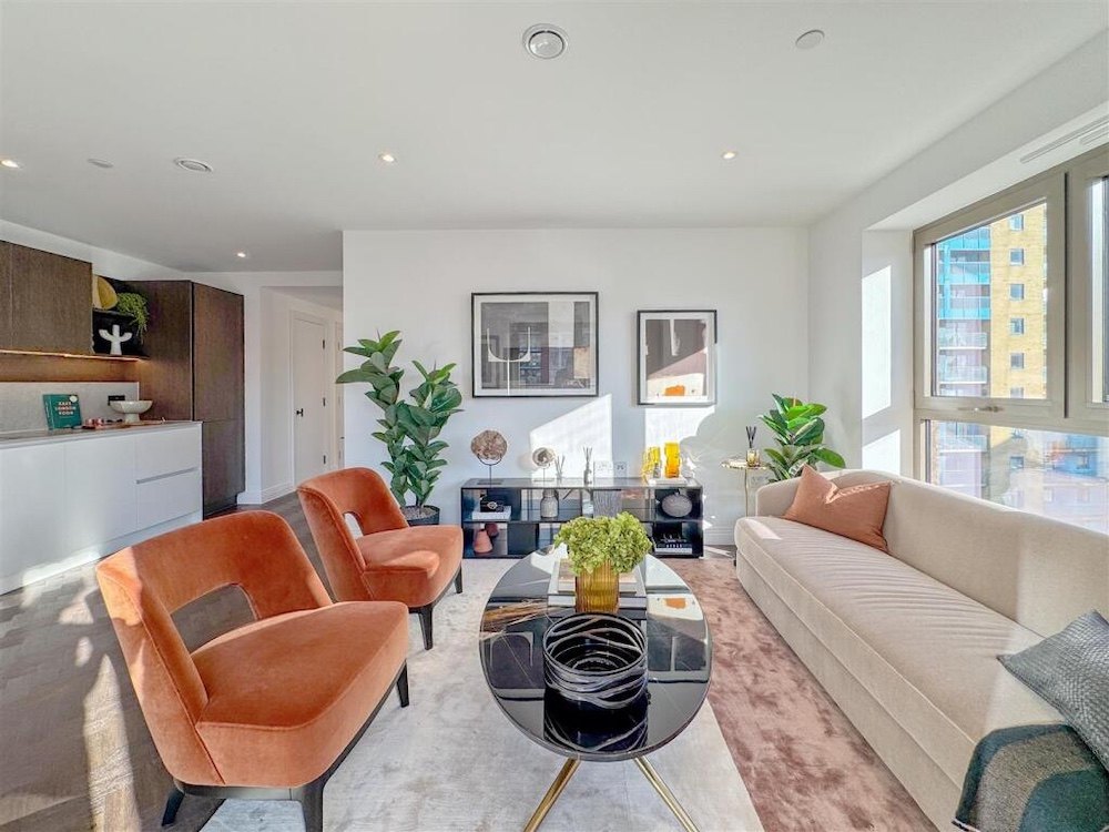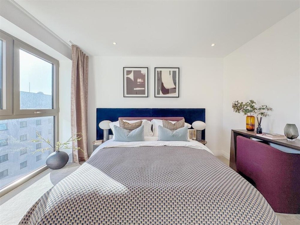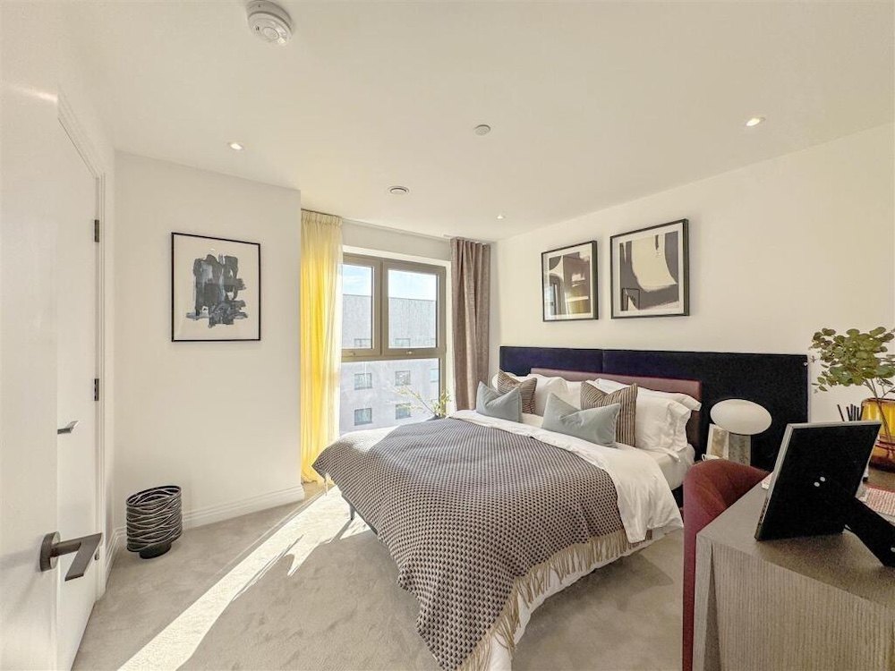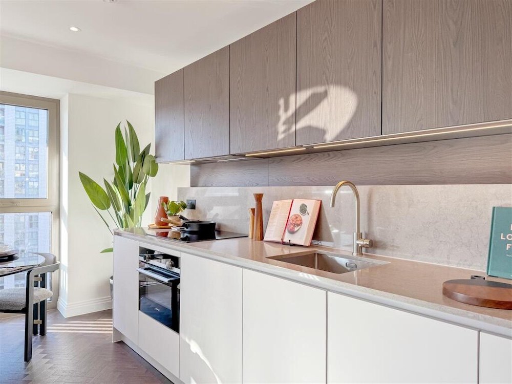 Only 3 minutes on foot to Custom House Station, with excellent connectivity via the DLR and Elizabeth Line. A bright, interior-designed one-bedroom apartment with a balcony. The open-plan living area boasts a contemporary design, featuring a sleek kitchen with high-end integrated appliances, USB outlets, and a steam-cleaning oven. The kitchen is complemented by durable stone composite countertops and stylish painted cabinetry. Large windows flood this apartment with natural light, creating a bright and inviting atmosphere. The spacious bedroom is well-lit and comes with a fully integrated wardrobe, offering excellent convenience and organisation. The bathroom is a tranquil retreat, complete with luxurious touches such as wall-mounted lighting, a heated towel rack, and a bathtub. Elegant marble-like tiles and a clever storage cabinet behind the mirror ensure the space remains tidy and practical.