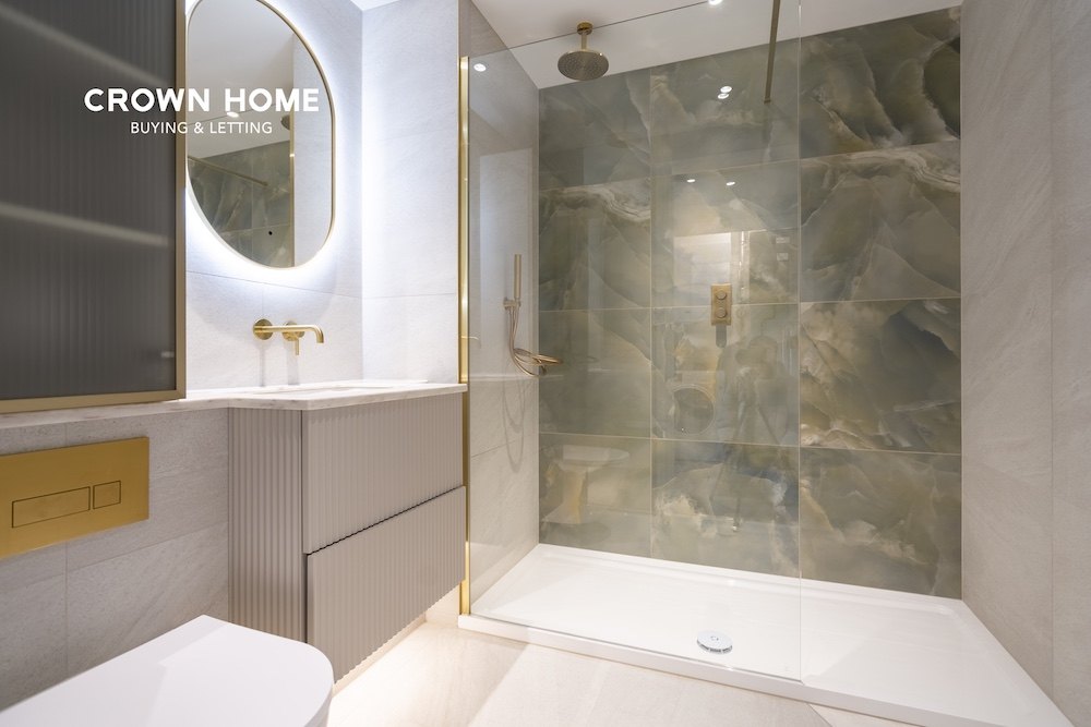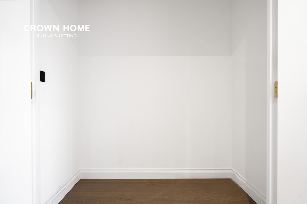 The apartment is equipped with energy-efficient LED lighting, black-finish switches and sockets with integrated USB points, underfloor heating, comfort cooling, and a washer–dryer discreetly housed within the utility cupboard.