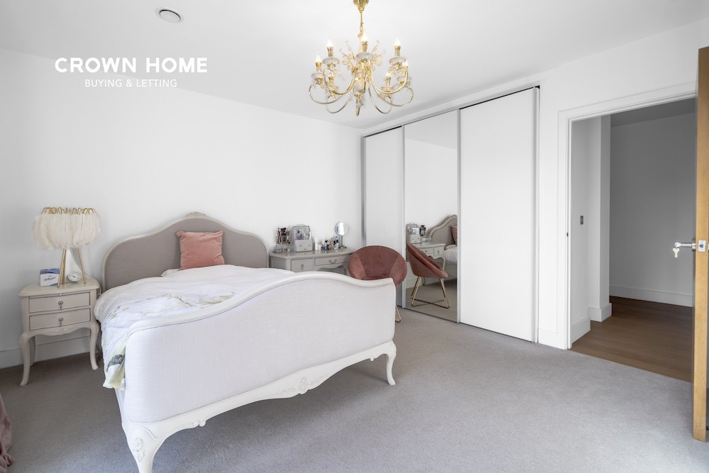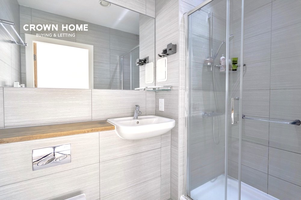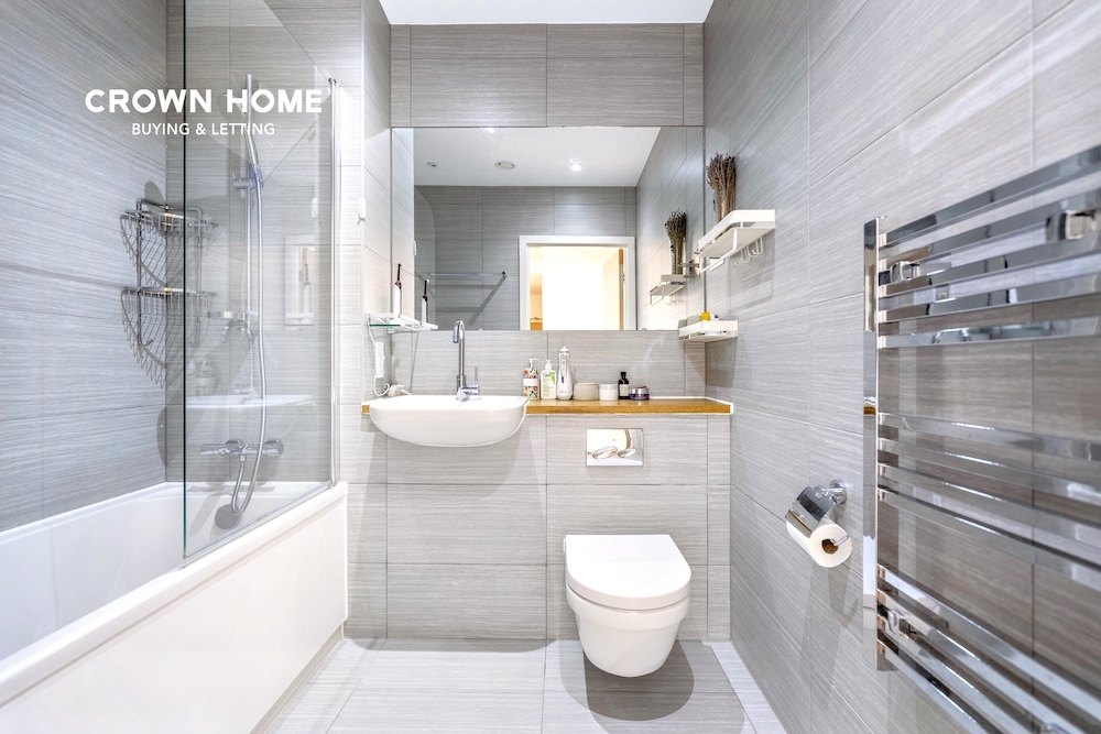 两间卧室面积宽敞,均铺设地毯;其中主卧配备现代化的独立卫浴。此外,公寓还设有一间设计简约时尚的家庭浴室,整体风格现代而高雅。