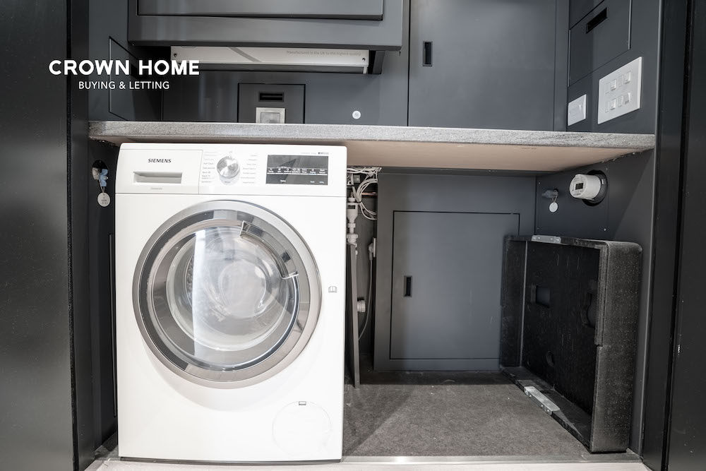 The modern kitchen is equipped with integrated appliances, including a fridge/freezer, oven, microwave, and induction hob. The composite stone worktop provides an ideal space for both cooking and socializing.