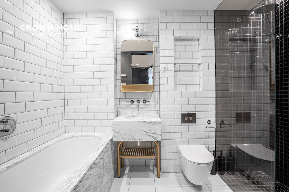 Both spacious bedrooms feature floor-to-ceiling windows, integrated wardrobes, and high-quality fixtures. The master bedroom boasts a luxurious en-suite bathroom, while the second bedroom offers direct access to another high-standard bathroom, complete with a tub, rain shower, and mirrored vanity units.