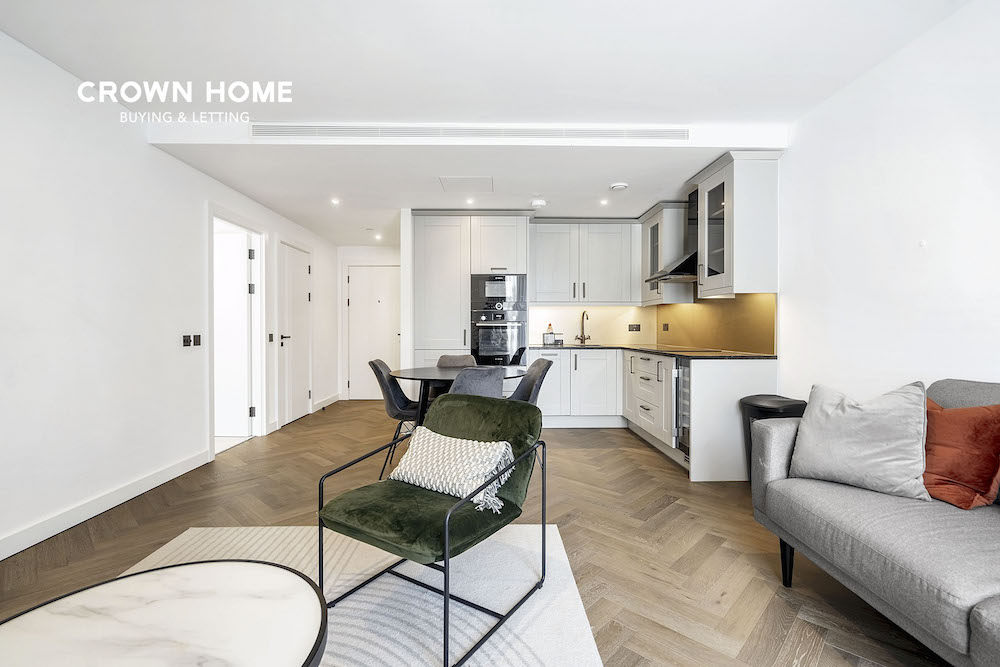 Floor-to-ceiling windows flood the interior with natural light. The modern kitchen is fully equipped with integrated appliances, a wine cooler, and a sleek composite stone worktop. The bedroom boasts a dedicated dressing area with fitted wardrobes and elegant ceiling pendant lighting. The bathroom is designed for relaxation, featuring an oval basin, wooden vanity unit, and black ironmongery that lend a luxurious, spa-like feel.