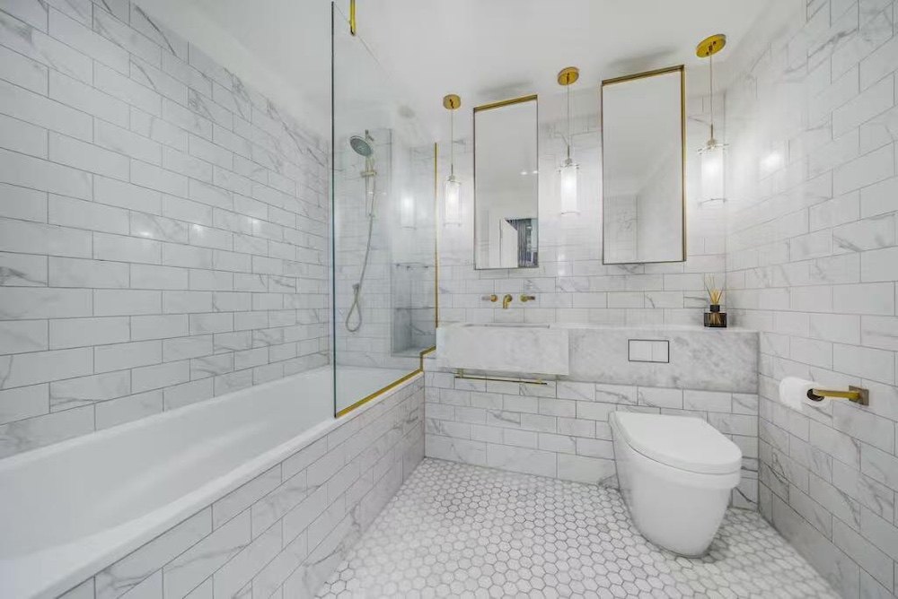 The bedroom boasts floor-to-ceiling windows and a dedicated dressing area with fully integrated wardrobes, creating a calm and practical space to start the day. It benefits from a stylish en-suite bathroom complete with a bathtub, brushed-gold fixtures and a sleek tiled finish, while underfloor heating in the bathrooms adds an extra layer of comfort. The apartment also features comfort cooling throughout. A separate guest WC is conveniently located off the hallway, ideal for visitors.